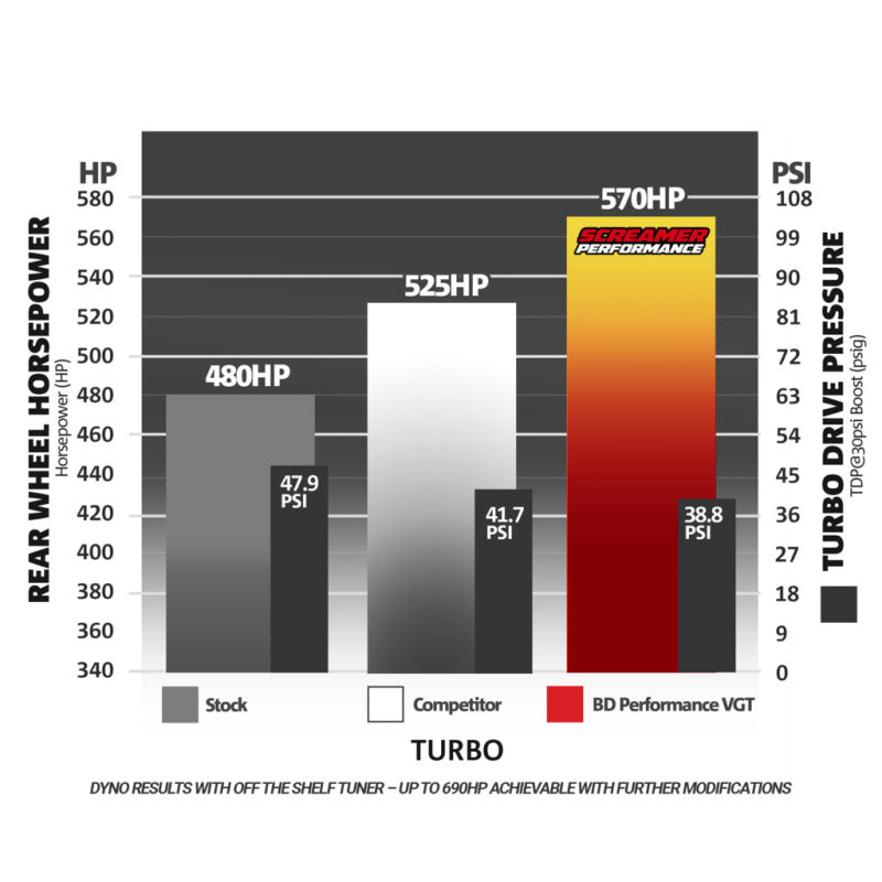 A drop-in stock installation, stock looking replacement that is anything but stock! The larger Ballistic Billet compressor wheel and our new exclusive Low MOI QST turbine wheel results in reduced backpressure, quicker response, increased efficiency and increased turbine flow compared to the competition. This results in increased maximum potential power output, right up to 690 horsepower with performance modifications. No extra parts to install, just drop-in and enjoy the extra power potential.